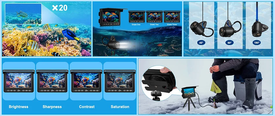 Three adjustable angles of 45 °/90 °/180 ° let you not miss any angle scene. Under water, the visible range is around 30-45m(98ft-148ft)