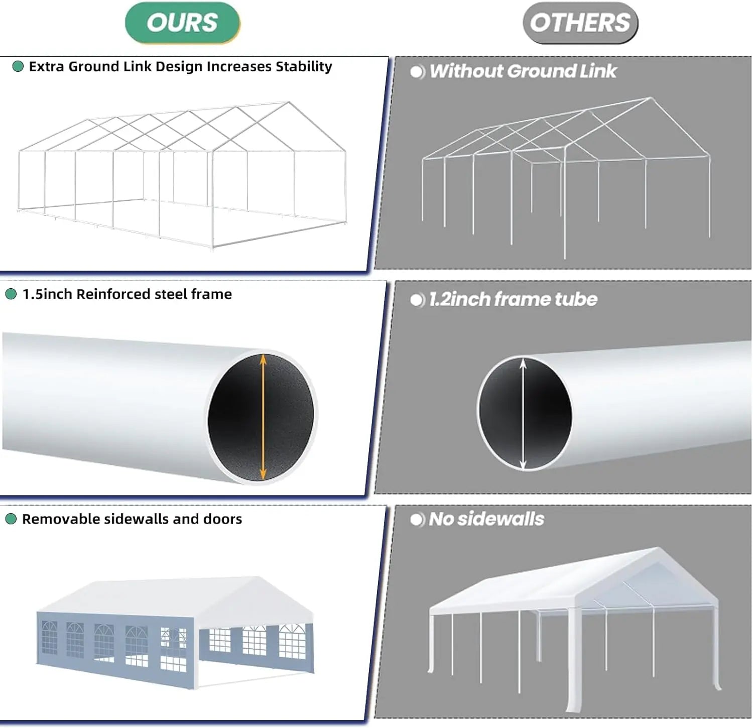 [ Sturdy Steel Frame ] Our party tent features an upgraded frame constructed from high-quality, heavy-duty, and corrosion-resistant galvanized steel. The 1.5-inch diameter steel tubes and 1.66-inch diameter metal connectors provide robust support and stability.