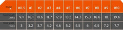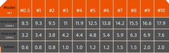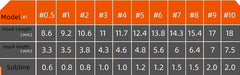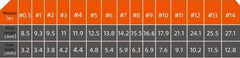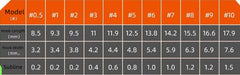 Specifications: no. 0.5, no. 1, no. 2, no. 3, no. 4, no. 5, no. 6, no. 7, no. 8, no. 9, no. 10, no. 11, No. 12, No. 13, No. 14