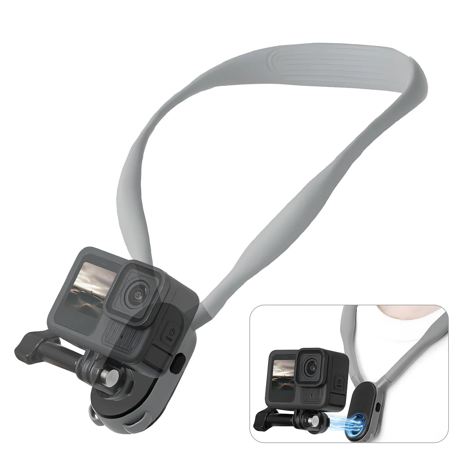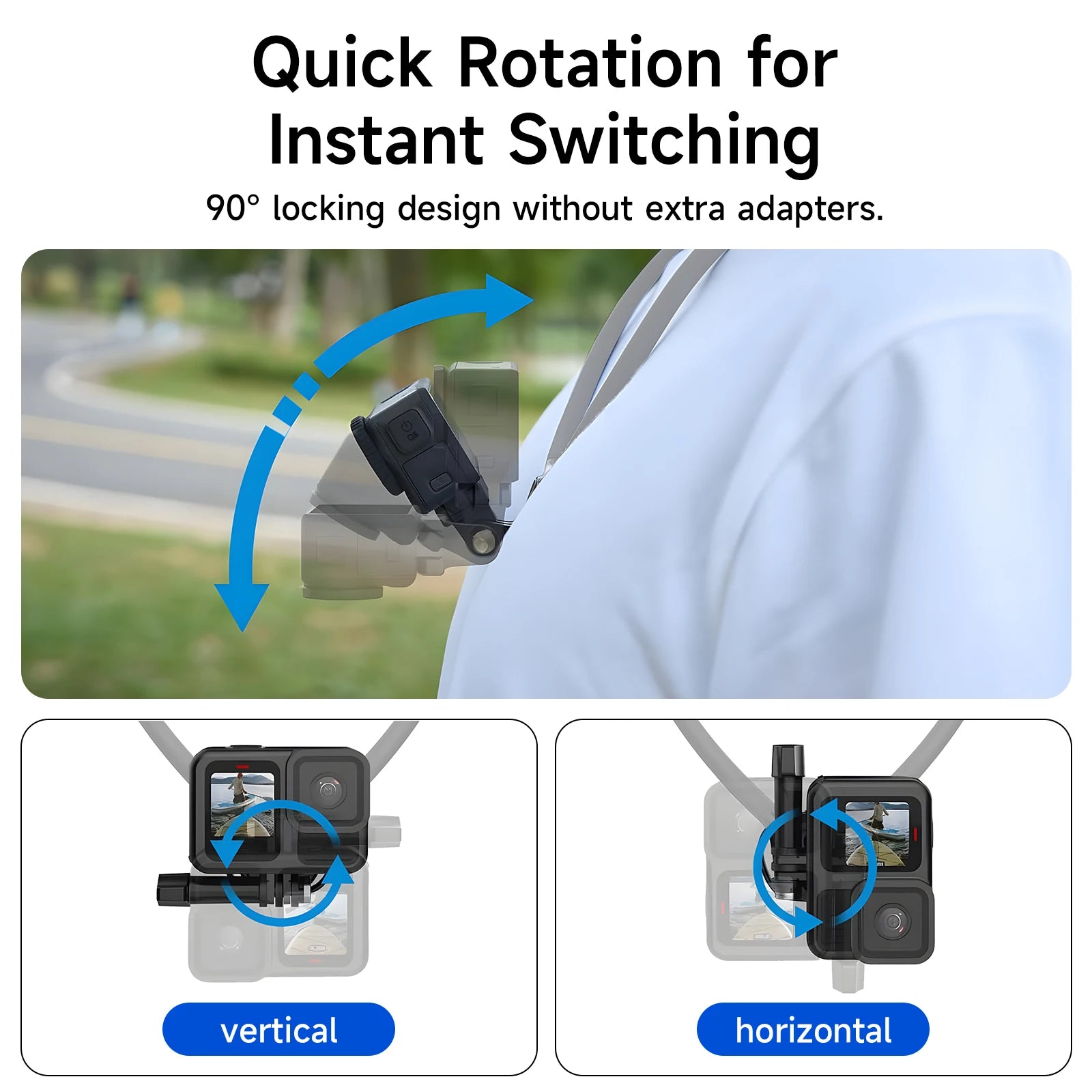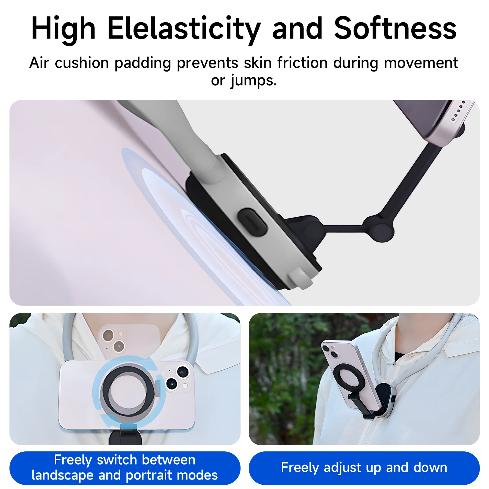 Neck Mount with an innovative built-in swivel function that supports 90-degree rotation , instantly switching between horizontal and vertical views without the need for extra accessory adapters. Equipped with air cushion protection underneath the neck-hanging base, it reduces friction and discomfort when exercising. Meanwhile, equipped with an adjustable chest strap. The improved stability allows you to run and jump or other dynamic activities, the phone or action camera is still stable, avoid shaking, and move and shoot smoothly.